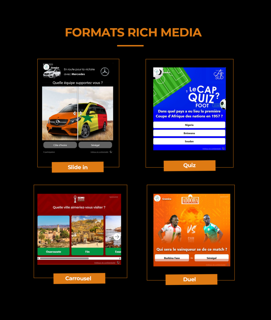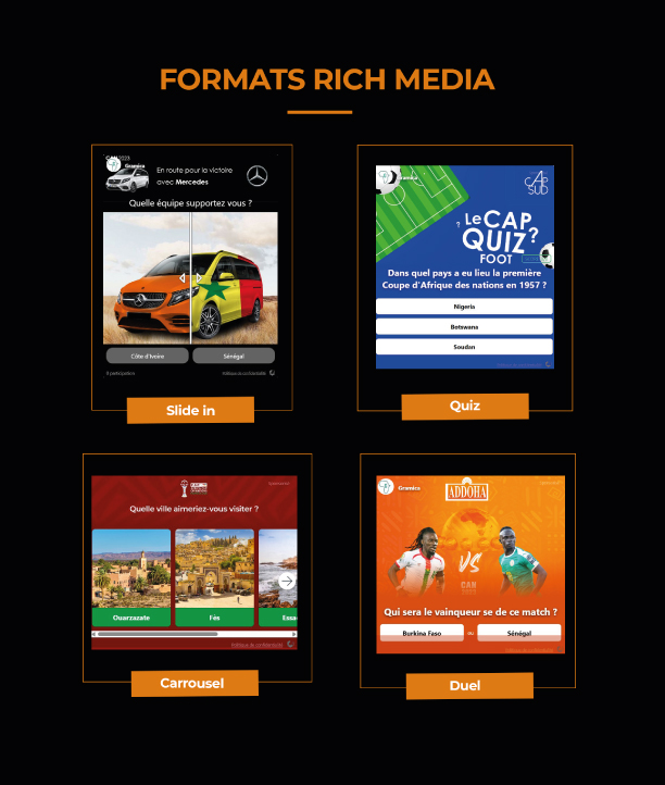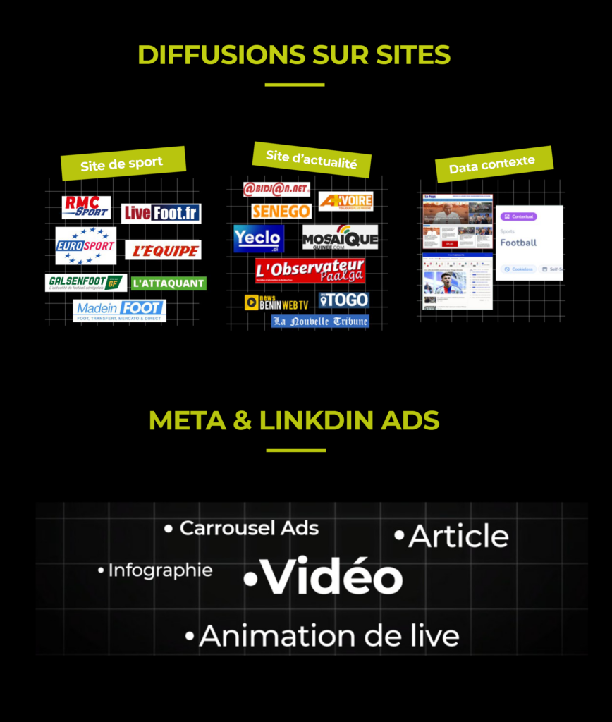 Nous diffusons vos campagnes sur des sites locaux et panafricains grâce à des formats interactifs Rich Media, permettant d’atteindre avec précision les audiences africaines et la diaspora. Nous proposons des solutions d’achat média via notre régie, en programmatique et sur Google Ads.