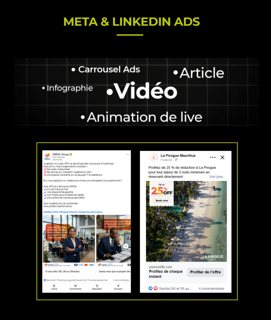 Notre maîtrise des réseaux sociaux nous permet de concevoir des campagnes efficaces en social ads et de mettre en place des stratégies de sponsoring adaptées à vos objectifs : notoriété, trafic ou conversion.