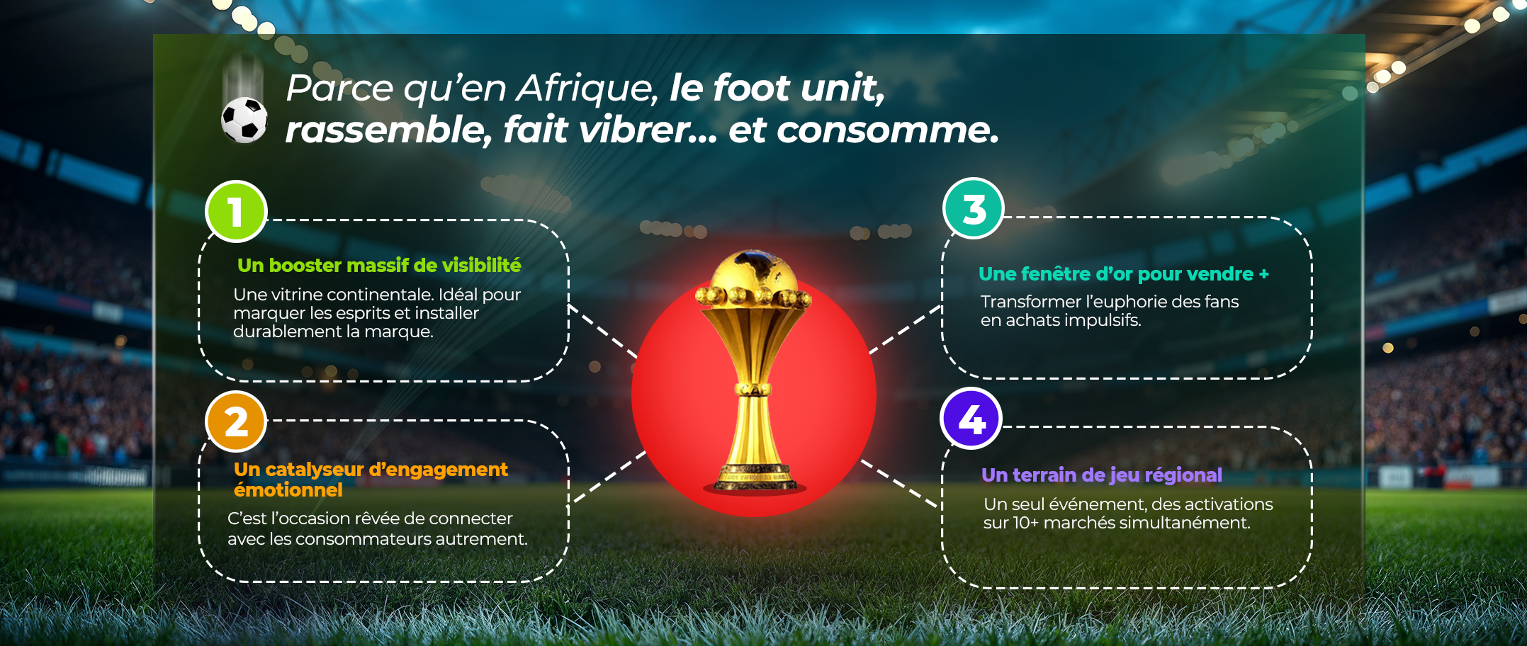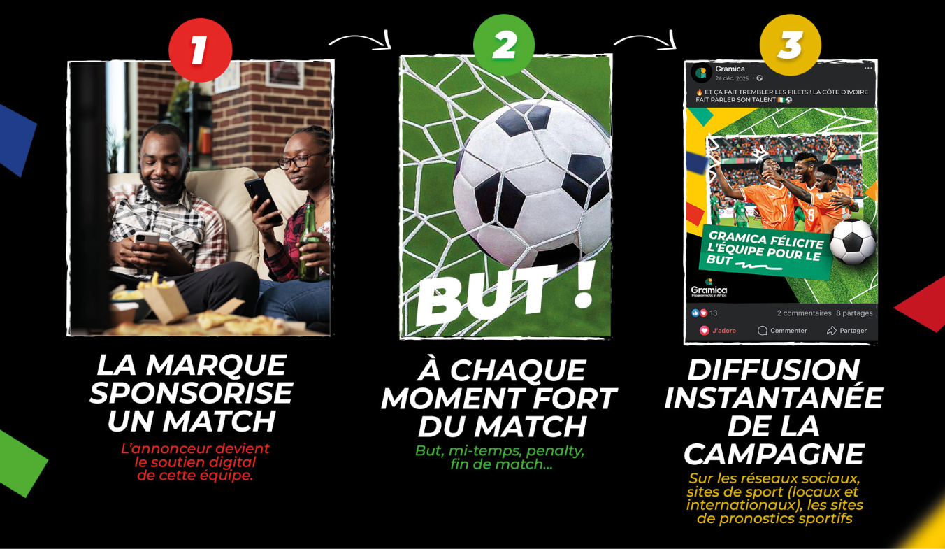 Choisissez un match emblématique (ex : Côte d’Ivoirevs Cameroun) et devenezle partenaire digital exclusif de l’équipe de votre choix.